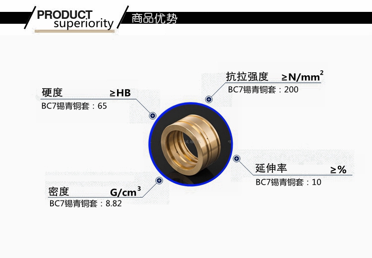 BC7鑄造錫青銅有中等的強度,良好的耐磨性,易加工等特點。主要應用于壓力10MPa,速度2.5m/s條件下工作的軸承、軸套和其它耐磨件。對應國標ZCuSn6Zn6Pb3