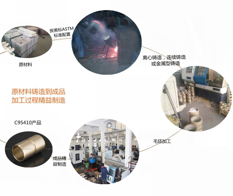 本產(chǎn)品實(shí)行ASTM標(biāo)準(zhǔn)………………………………………………… 根據(jù)客戶產(chǎn)品需求我們提供的鑄造方式有:離心鑄造,連續(xù)鑄造和金屬型鑄造?!?牌號C95410合金銅化學(xué)成分:Cu≥83 Fe3-5 Al10-11.5 Mn0.5 Ni1.5-2.5