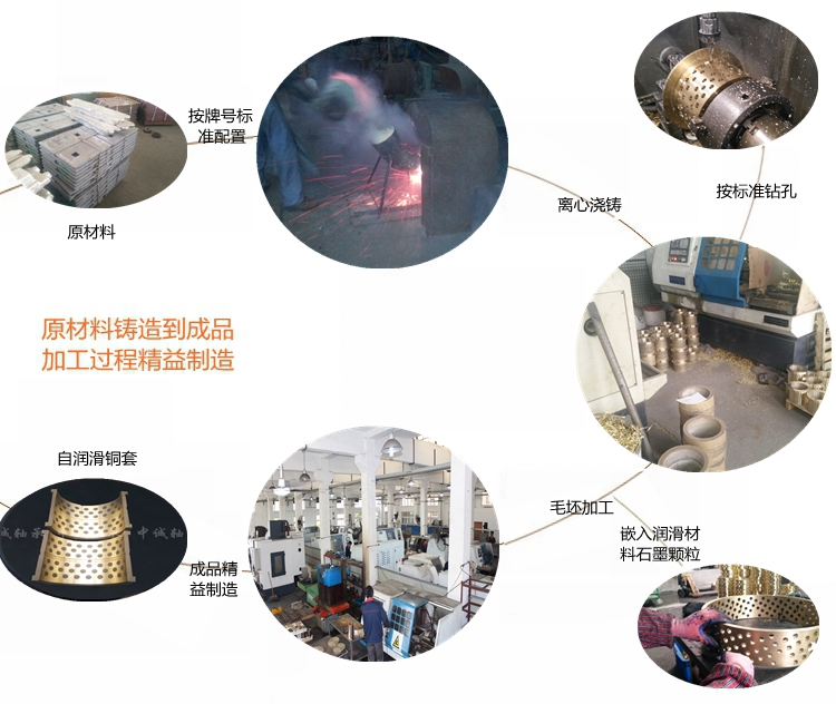 我們根據使用工況和環(huán)境要求,選擇不同的銅合金材料,如大氣環(huán)境選擇高力黃銅為基體;水環(huán)境下一般選用錫青銅為基體;高溫或海水腐蝕等工作環(huán)境選用鋁青銅為基體;其他特殊工況環(huán)境選擇相應的銅合金材料為基體;然后根據產品的實際受力情況和運動方式,確定潤滑劑的排布方式和密度,以求達到最佳使用效果和壽命。 銅石墨軸承使用廣泛,如冶金機械,工程機械,注塑機械,水利機械,海工裝備,風電設備,模具行業(yè),印刷包裝機械,礦山設備,石油化工機械,各種輕工機械等等。