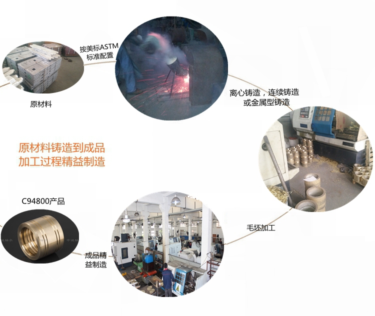 本產(chǎn)品實(shí)行ASTM標(biāo)準(zhǔn)………………………………………………… 根據(jù)客戶產(chǎn)品需求我們提供的鑄造方式有:離心鑄造,連續(xù)鑄造和金屬型鑄造?!?牌號(hào)C94800合金銅化學(xué)成分:Cu84-89 Sn4.5-6 Pb0.3-1 Zn1-2.5 Fe0.25 Al0.005 Mn0.2 Si0.005 Ni4.5-6 Sb0.15 P0.05 S0.05